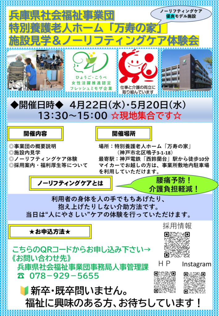 神戸市北区にある特別養護老人ホーム「万寿の家」で施設見学&ノーリフティングケア体験会を開催します。
